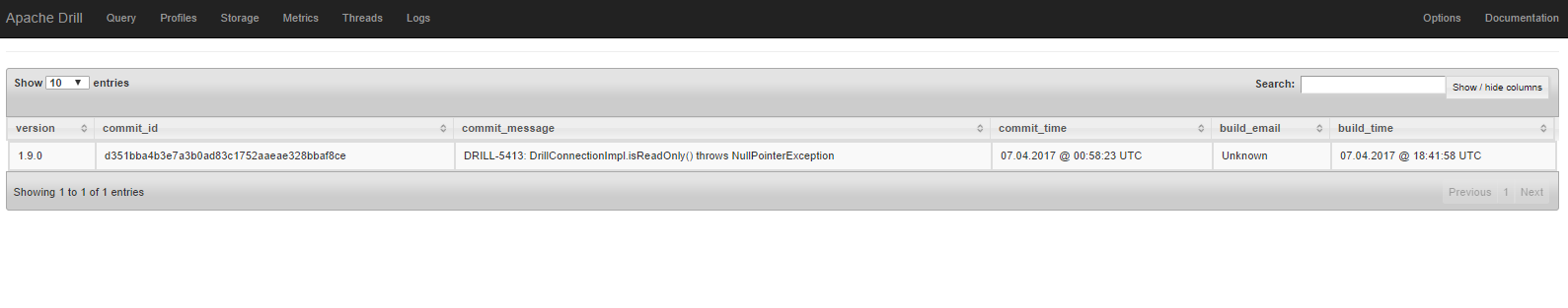 Make sure that we are using DRILL Server version which is newer or equal to following: (Earlier packages has a bug which will throw a 'NullPointerException' on DrillConnectionImpl.isReadOnly().